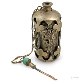 • Lot n° 0453 Portaincenso in metallo argentato finemente cesellato ed elemento in pasta vitrea, XX secolo, altezza cm 8