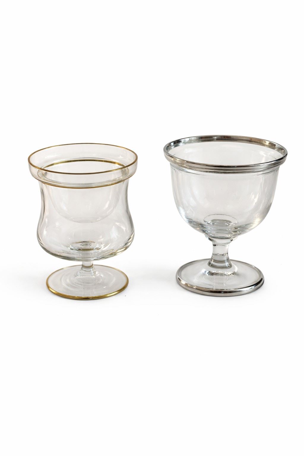 Lotto di portacaviale in vetro - Insieme composto da undici portacaviale in vetro trasparente su piede, caratterizzati da corpo leggermente svasato e bordo rifinito da sottile fascia dorata. Linea elegante e funzionale, adatta al servizio da tavola (in foto a sinistra).Il lotto è completato da un dodicesimo esemplare di modello differente, sempre in vetro su piede ma con proporzioni più arrotondate e bordo con finitura metallica argentata (in foto a destra). Dimensioni :modello principale: h cm 7;modello differente: h cm 8.I lotti oggetto della presente asta sono ubicati presso un’abitazione privata sita in Roma.La partecipazione all’asta implica la piena accettazione della condizione secondo cui il ritiro dei beni aggiudicati sarà interamente a cura, rischio e spese dell’aggiudicatario.Resta inteso che eventuali operazioni di smontaggio, imballaggio, trasporto e ritiro dovranno essere organizzate direttamente dall’aggiudicatario.Si raccomanda pertanto di richiedere preventivamente tutte le informazioni necessarie, anche al fine di acquisire eventuali preventivi per il trasporto prima di formulare un’offerta. - -