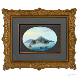 Veduta marina con pescatori, XX secolo, gouache su carta, cm 32x41 compreso passepartout, entro cornice