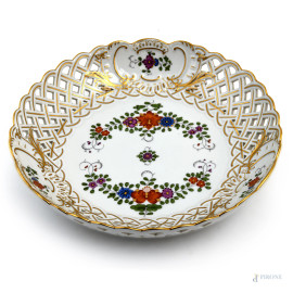 Centrotavola in porcellana Meissen decorato in oro e motivi floreali, XX secolo, diametro cm 24