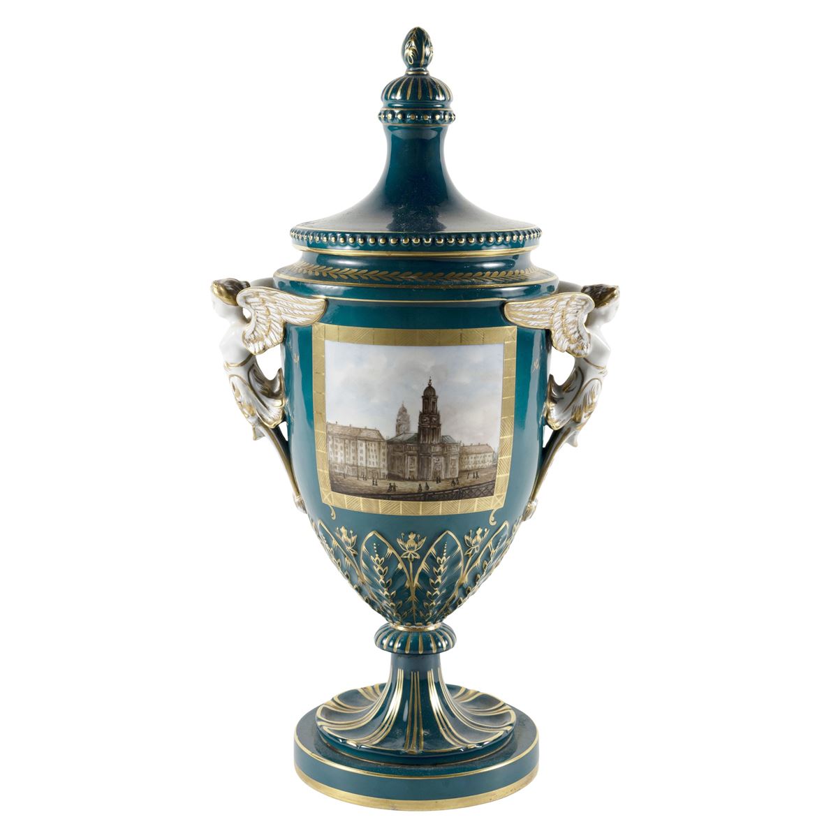 • Lot n° 0272 Potiche in porcellana policroma e parzialmente dorata - corpo ovoidale su base circolare, al centro veduta architettonica entro riserva rettangolare, prese a foggia di figure alate, marchio della produzione - 43x24 cm. -
